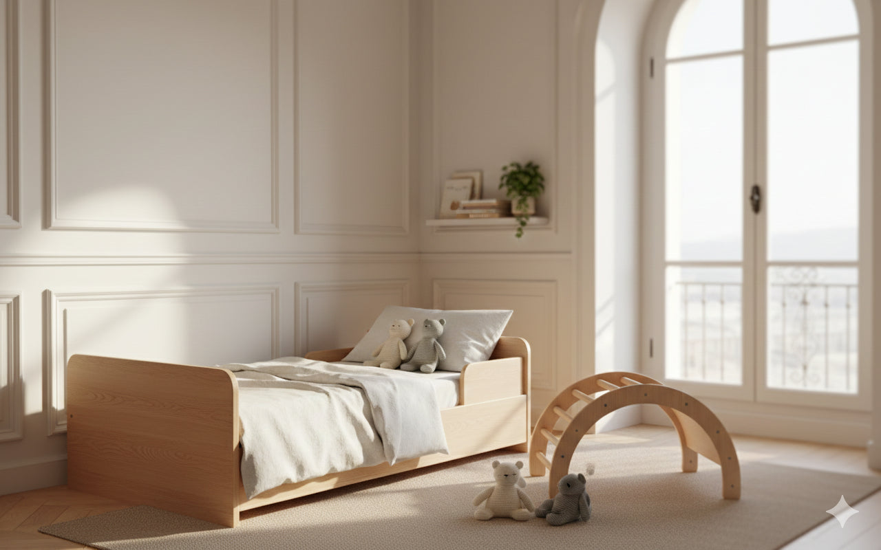 C'est pourquoi nous avons décidé de créer une collection de lits au sol qui respectent scrupuleusement les principes de Maria Montessori. Chaque pièce est sélectionnée pour sa qualité de fabrication et sa capacité à offrir un espace de liberté sécurisé. Notre mission est d'accompagner les familles dans la création d'un foyer où l'enfant peut dire : aide-moi à faire seul.